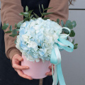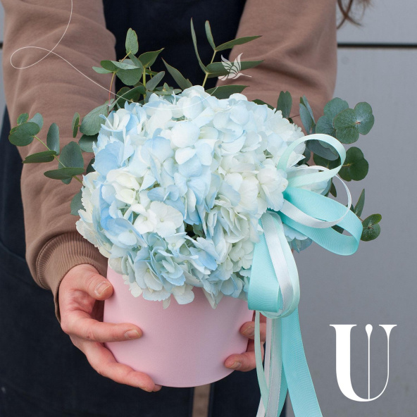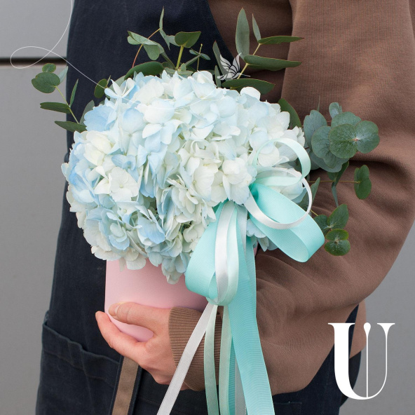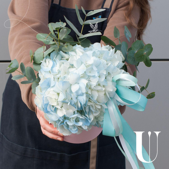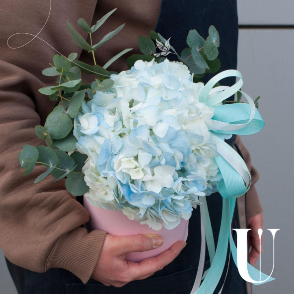 Особенностью данной композиции является использование гортензии голубого цвета. Этот цветок символизирует нежность и любовь, что делает его прекрасным выбором для подарка на День матери или День рождения.
