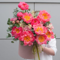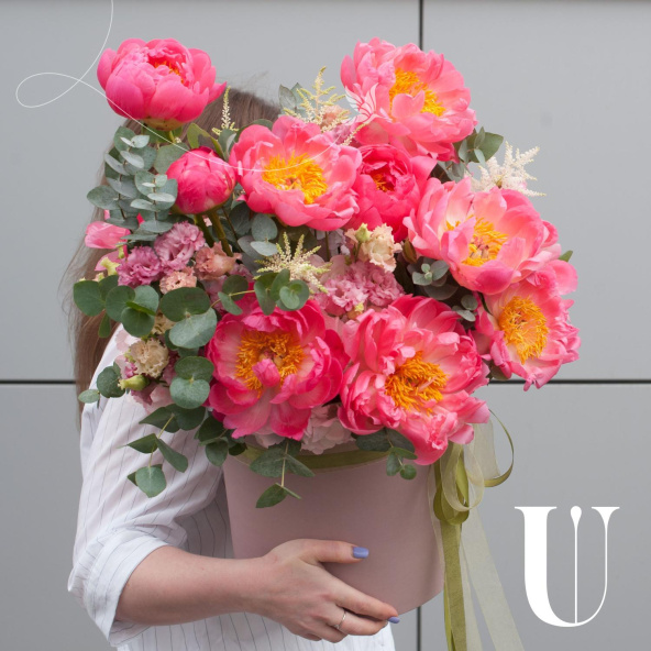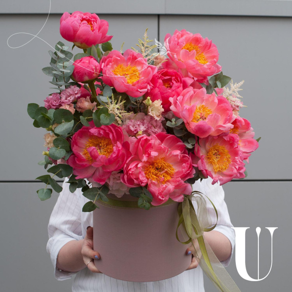 Представляем вашему вниманию композицию в коробке "Коралловые краски", состоящую из 15 коралловых пионов, 3 гортензий, 5 ветвей эвкалипта, 6 астильб, 5 лизиантусов.