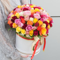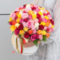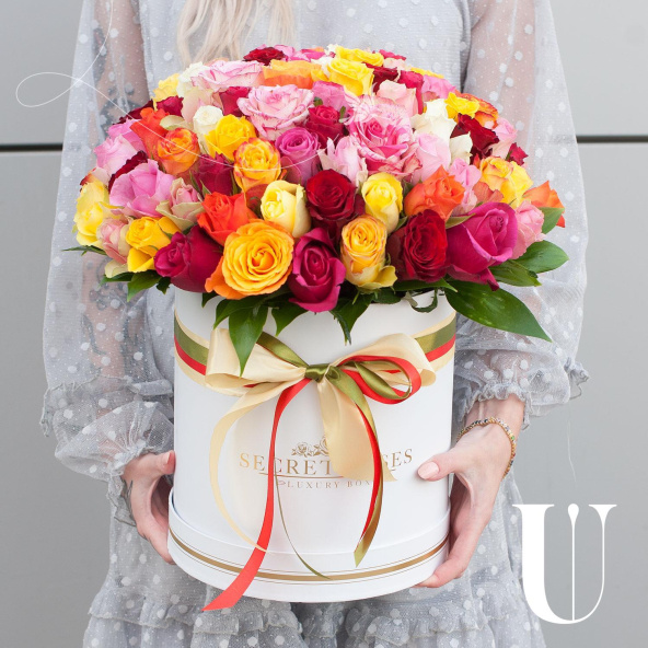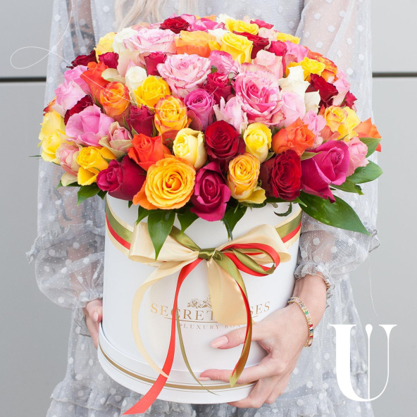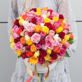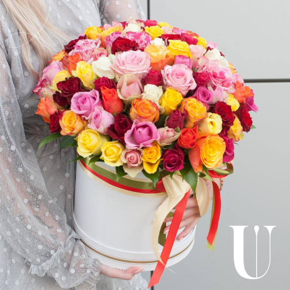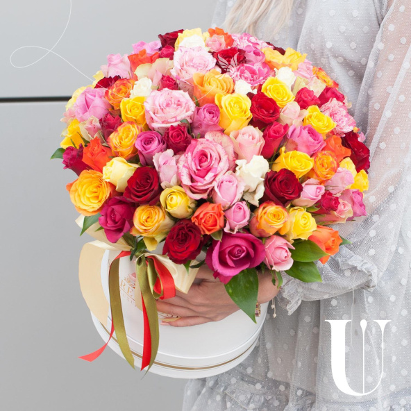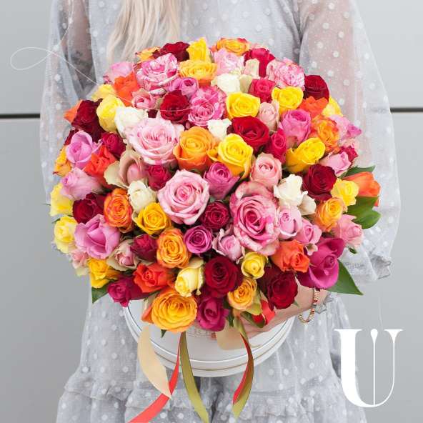 Букет состоит из 101 разноцветной розы, что делает его ярким и запоминающимся.