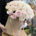Розовые диантусы, нежно-розовые кустовые розы и белые лизиантусы в шляпной коробке
