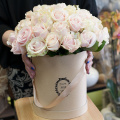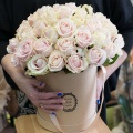 Цветочная композиция из роз Вайт Охара, кустовых пионовидных роз Бомбастик и белых эустом в шляпной коробке