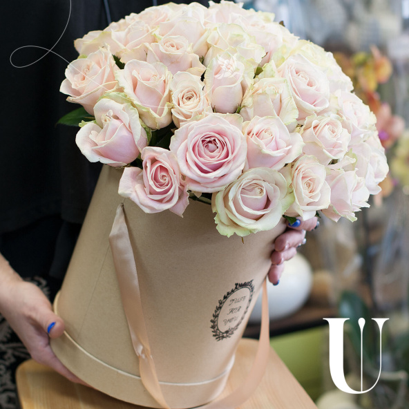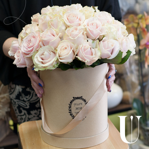 Дизайнерская композиция из розовых роз, роз Шангри Ла и папоротника в шляпной коробке