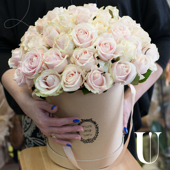 Розовые розы и белые эустомы в бархатной шляпной коробке