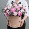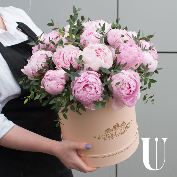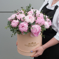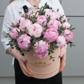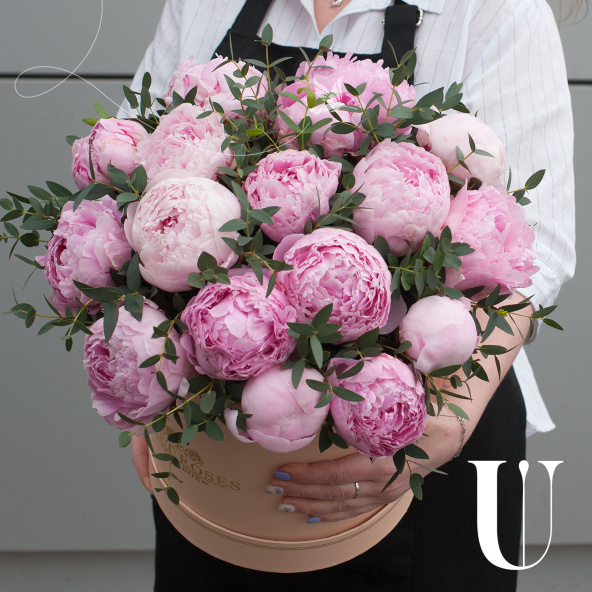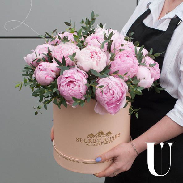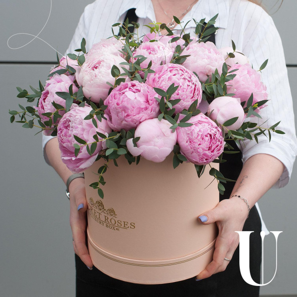 Коробка из розовых пионов с эвкалиптом "Милое создание" - это изысканный и стильный подарок, который подойдет для любого повода.