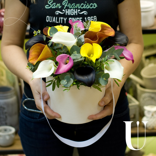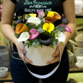 Нежная композиция из орхидей и альстромерий в шляпной коробке маджестик