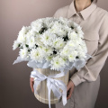 Гвоздики, розы, эустома и другие цветы в шляпной коробке