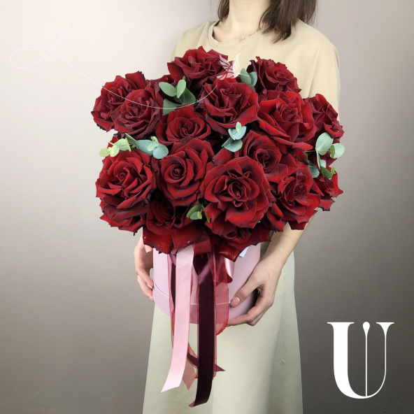 Композиция из роз, эустомы, диантуса и других цветов в бордовой шляпной коробке