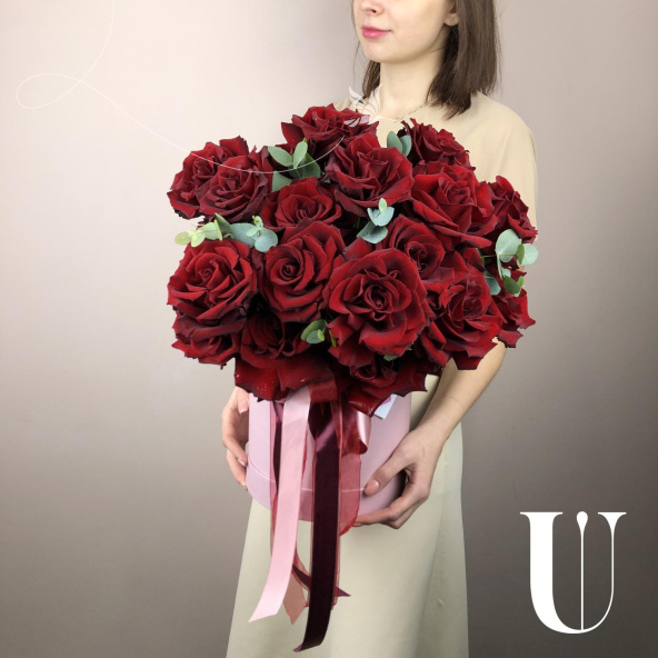 Розовые розы и белые эустомы в бархатной шляпной коробке