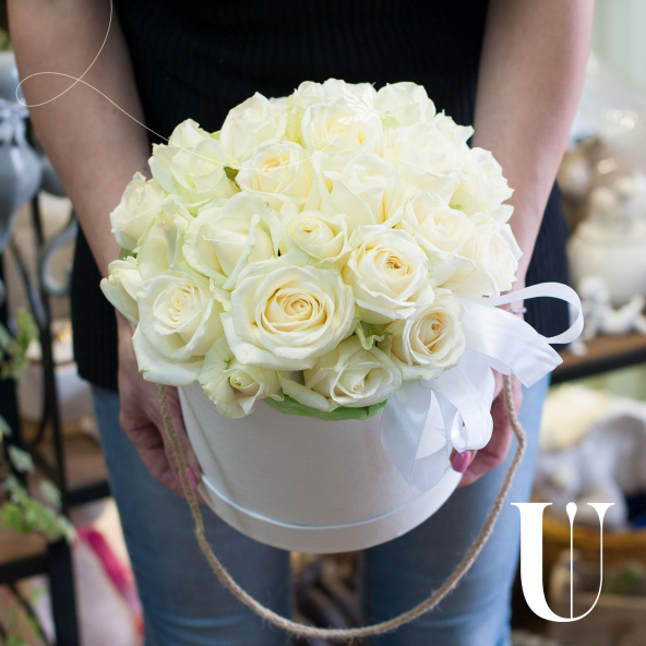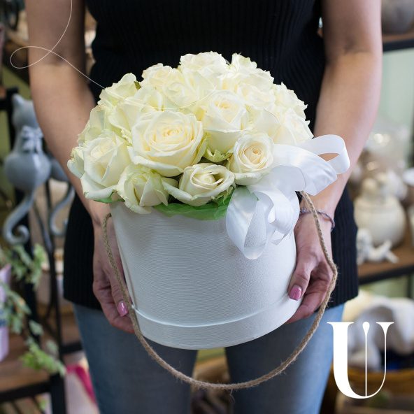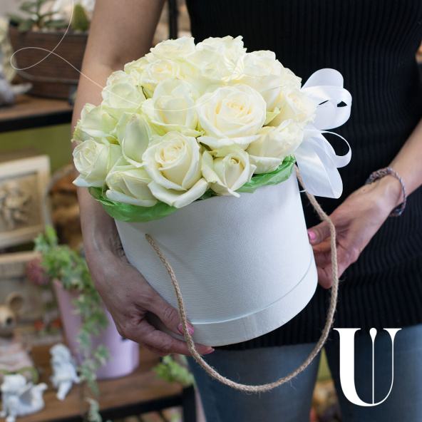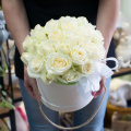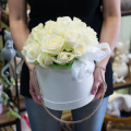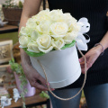 Композиция из белых орхидей и розовых роз в шляпной коробке