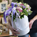 Нежная композиция из орхидей и альстромерий в шляпной коробке маджестик
