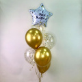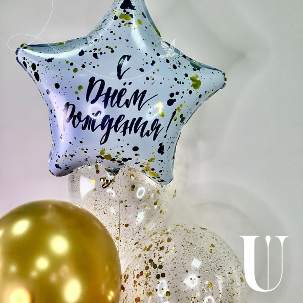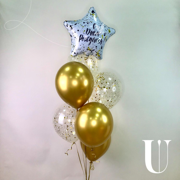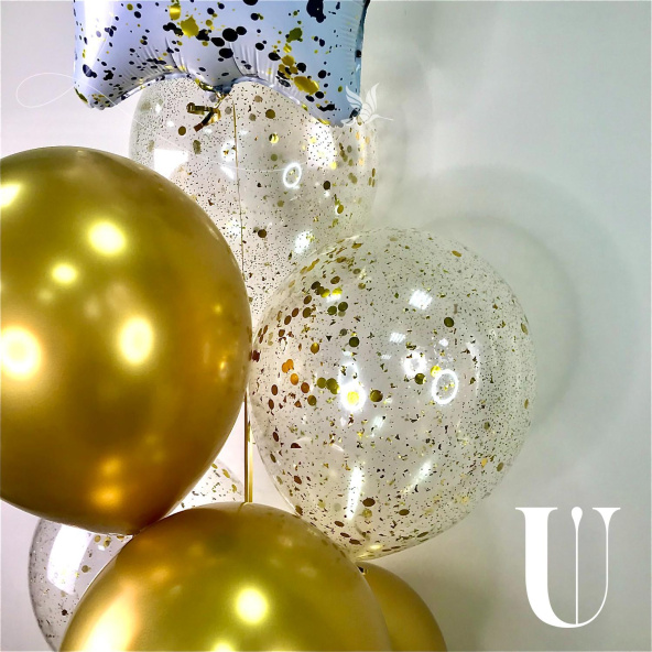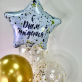 Яркая композиция из гелиевых шаров, которая динамично устремляется вверх, как фонтан из брызг шампанского