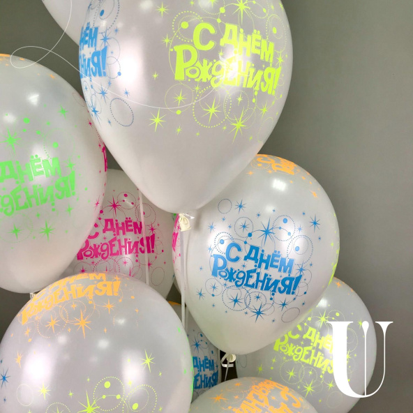 Фонтан шаров с яркими латексными шарами с надписью "с дем рождения" (25 см.) - 11 см.